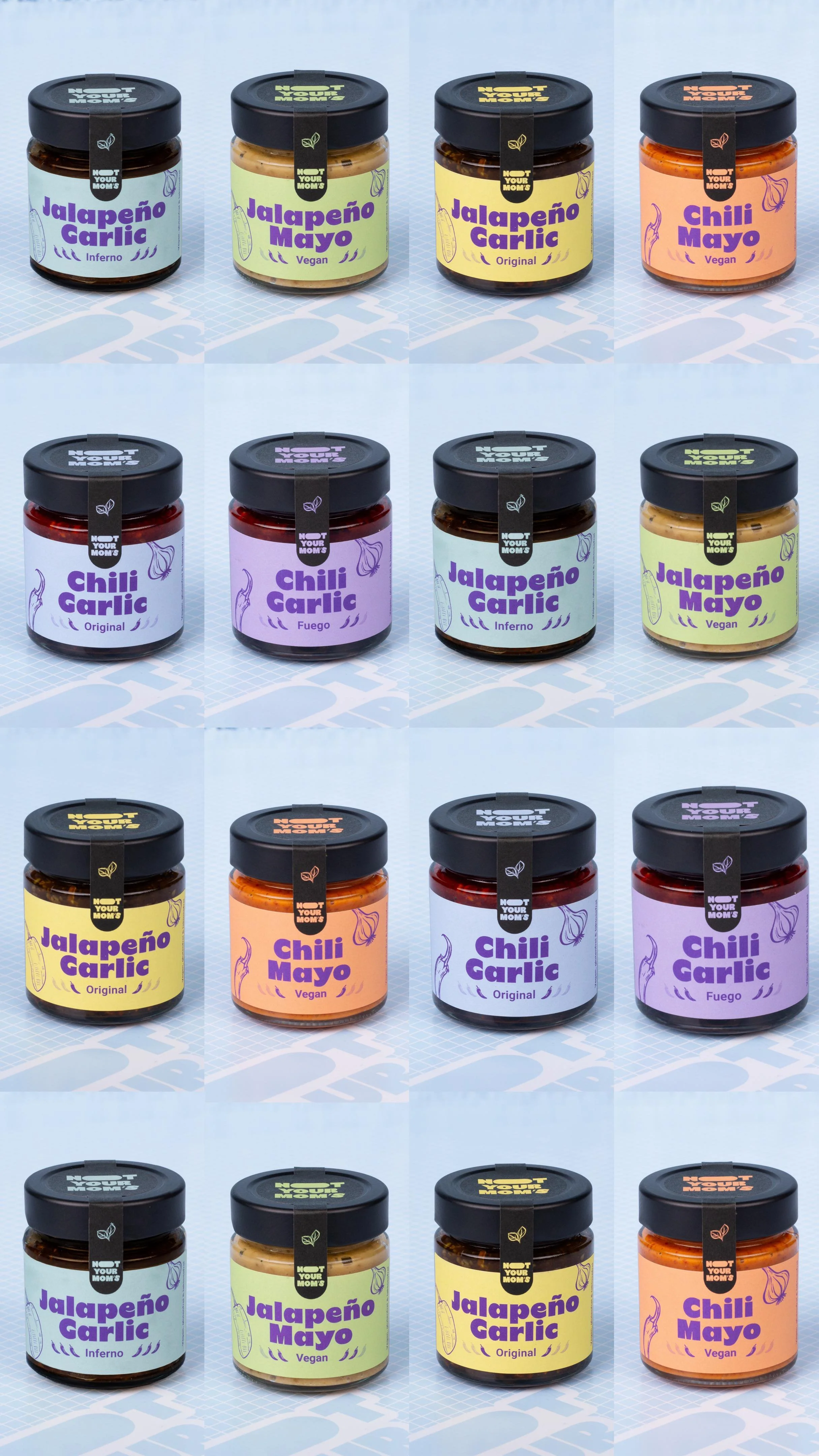 Fuego kommt mit einer angenehmen, aber schon deutlicheren Schärfe im Nachgang, die allerdings wunderbar mit den weiteren Aromen harmoniert. Wer eine gewisse Schärfe liebt, ist hier genau richtig!Jalapeño Garlic zeichnet sich durch eine besondere Fruchtigkeit aus - gepaart mit einer unvergleichlichen Schärfe. Wie bei allen anderen Familien-Mitgliedern ist auch hier die Balance zwischen Süße, Säure und Umami-Geschmacksnoten typisch Not Your Mom’s. Für Liebhaber von feuriger aber noch lange nicht betäubender Schärfe.
