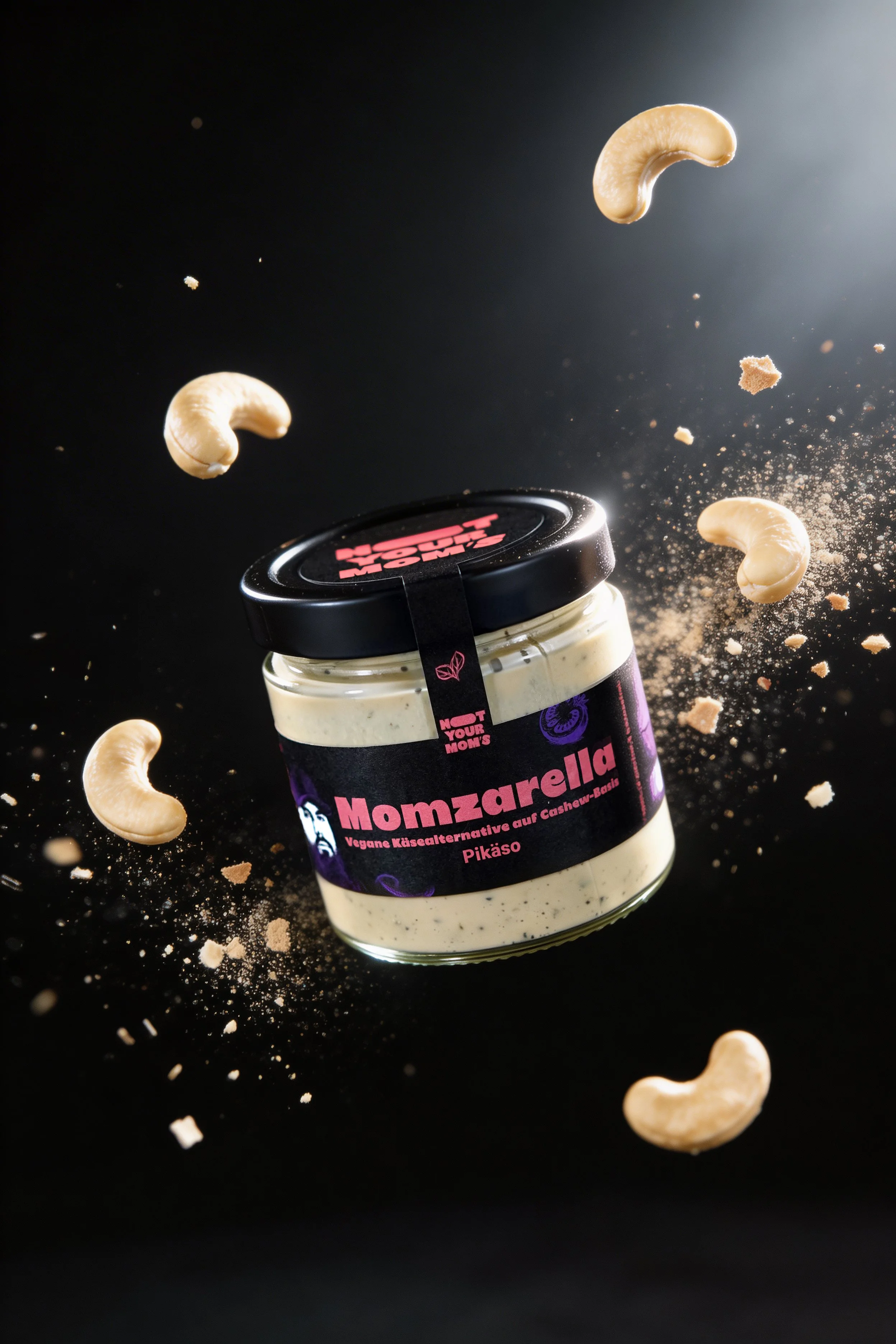 Bei unserem Momzarella handelt es sich um ein flüssig-cremiges veganes Käse-Ersatzprodukt auf Basis von Cashews, das vielfaltig eingesetzt werden kann.